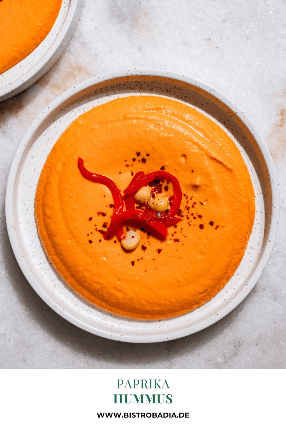 In this hummus variation, I have added a good portion of paprika to the classic hummus. I roasted the peppers in the oven beforehand to conjure up delicious roasted flavors in the dip. The peppers make this version a little more velvety than the version with tomatoes.