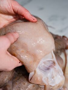 - Dar la vuelta a la cabeza (manto) del pulpo y retirar las tripas, si aún están presentes.