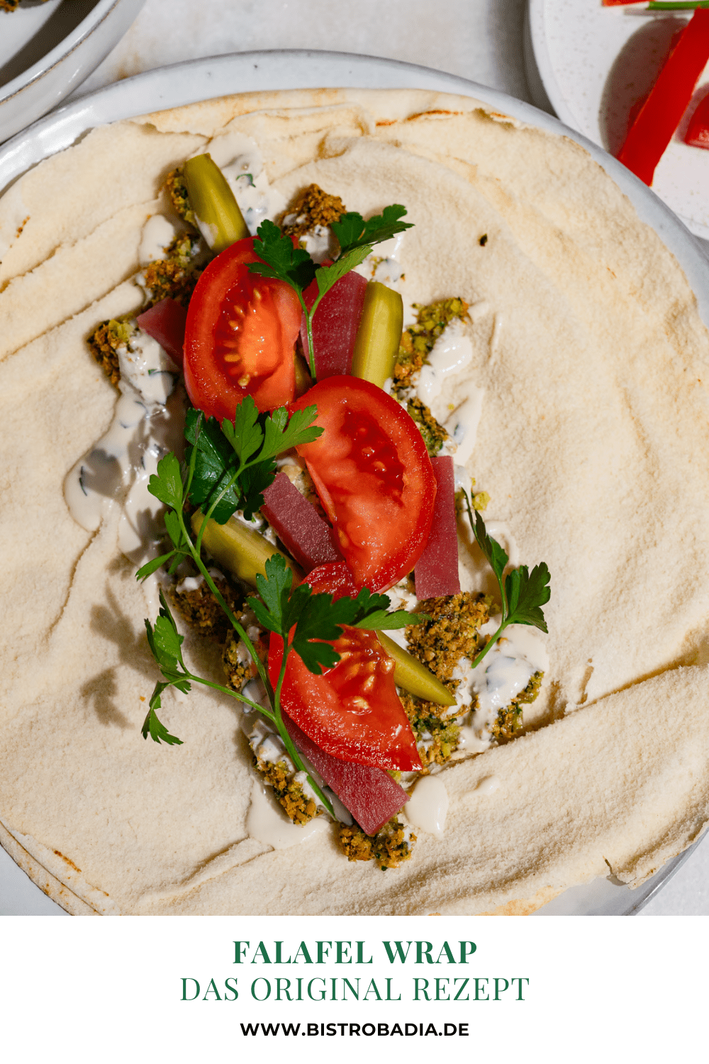 Si tu le souhaites, tu peux le replacer sous le gril du four pendant les dernières minutes – mais ce n’est pas obligatoire. Je mets encore quelques mini-tomates en grappe dans le four sur la grille supérieure pendant les 15 dernières minutes pour les faire griller. Et oui, il faut définitivement des frites dans le wrap ! Les Levantins sont de toute façon complètement fous de frites ! Il n’y a guère de déjeuner ou de dîner sans ces bâtonnets dorés frits. Quand j’étais enfant, je mettais même souvent une poignée de frites dans mon pain pita, je mettais du ketchup dessus et je le roulais en wrap. Meeega délicieux, il faut que je m’y remette…